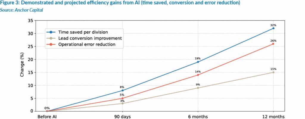 Across industries, early AI adoption is appearing most visible through time saved, cycle‑time compression and quality consistency. These are the building blocks to operating leverage: fewer hours per unit of output, faster conversion of activities into revenue, and limiting rework loops. As adoption matures, these efficiencies compound into margin resilience, improved client retention and broader capacity without proportional headcount growth.