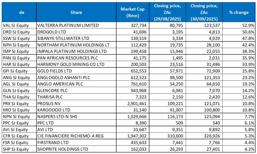 In a familiar theme this year, it was the precious metals miners that drove returns on the local bourse in September, with 12 of the 20 best-performing shares coming from the sector, buoyed by rising commodity prices. Valterra Platinum was last month’s best-performing share overall, with the counter surging by 52.9% MoM, driven by soaring platinum prices and the completion of its demerger from Anglo American (Anglo sold its remaining 15.5% stake, exiting the company following a two-stage demerger). The stellar performance came despite weak 1H25 results, where Valterra reported an 81% YoY drop in its half-year headline earnings per share (HEPS) and a 91% YoY decline in overall profit. Valterra has been one of 2025’s standout performers, soaring 117.1% YTD as platinum prices hit multi-year highs.