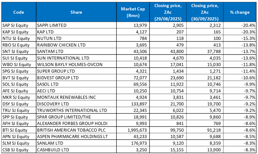 Figure 2: September 2025’s 20 worst-performing shares, MoM % change