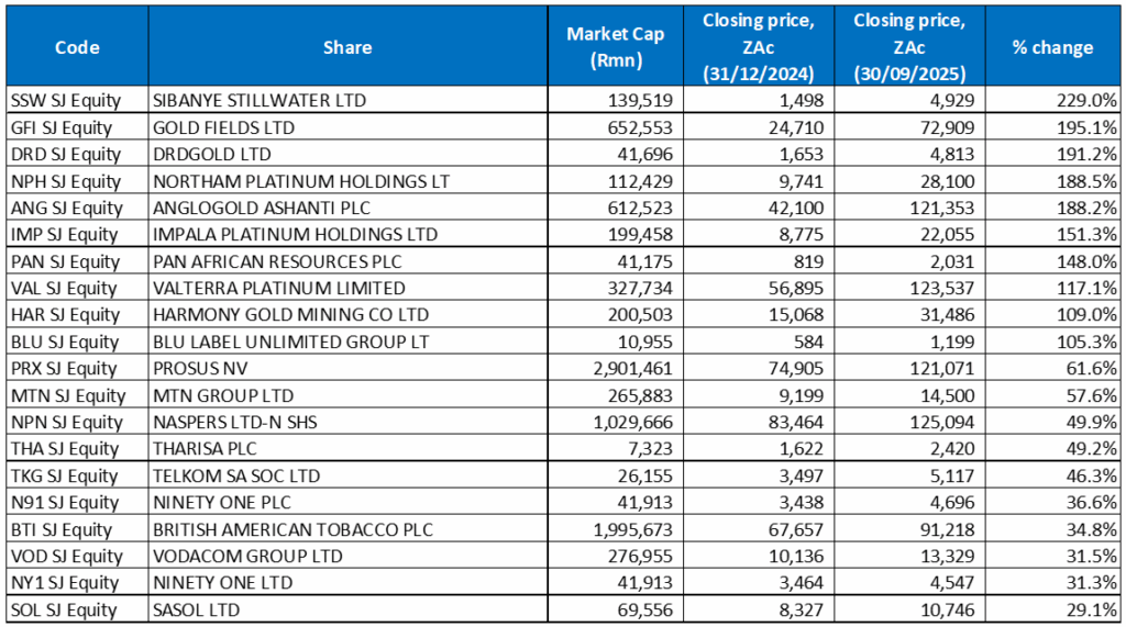 Record gold and platinum prices, spurred by safe-haven demand amid a confluence of macroeconomic and geopolitical factors, including global policy uncertainty, US Fed rate cut expectations, persistent inflation concerns, a weakening US dollar, and central bank buying of gold, continued to power the JSE’s YTD rally. The result is that eleven of the top-performing shares for the year to end September have again come from the commodities sector. There is also a major overlap with those to the end of August as gold and platinum miners, whose share prices have soared in 2025, continued to feature prominently among the best performers. Eighteen of the year to end August’s best performing shares were also among the best performing shares for the year to end September, with only two new entrants – Ninety One Plc and Ninety One Ltd.