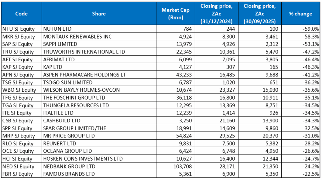 The worst-performing shares for the year ending September also showed a considerable overlap with those to the end of August, with nineteen stocks unchanged and only one new addition – Famous Brands. After a poor performance in September, when its share price declined by 15.3%, Nutun (-59.0% YTD) bumped renewable energy company Montauk Renewables (-58.3% YTD) from the top position to second place. Sappi (-53.1% YTD) took Afrimat’s third spot.
