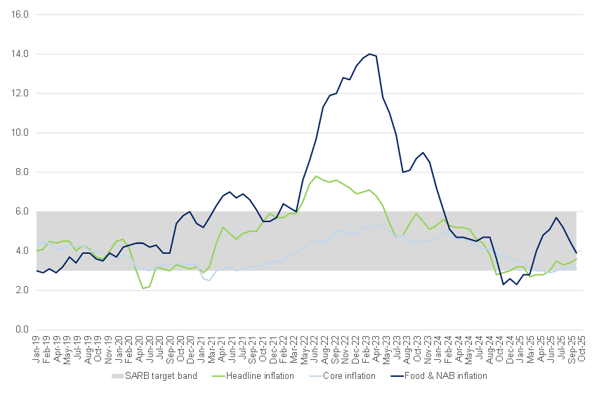 South Africa’s (SA) headline consumer inflation increased modestly to 3.6% YoY in October from 3.4% in September, undershooting market expectations and reflecting a broadly contained inflation environment. The key source of downside surprise relative to forecasts was food and non-alcoholic beverages (FNAB) inflation, which decelerated to 3.9% YoY, from 4.5% YoY in September. This moderation contributed to a softer core inflation outcome of 3.1% YoY, down from 3.2%.