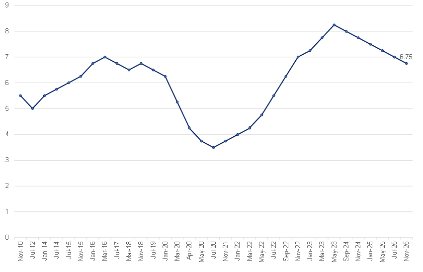 Against this backdrop, and in line with expectations, the South African Reserve Bank’s (SARB) Monetary Policy Committee (MPC) opted to reduce the policy rate by 25 bpts to 6.75%, effective 21 November. The prime lending rate now stands at 10.25%. The decision was unanimous, signalling confidence in the durability of the disinflation process and the scope for a less restrictive policy stance. The SARB’s Quarterly Projection Model (QPM) continues to indicate gradual rate reductions as inflation converges towards the target, although decisions will remain data-dependent and assessed meeting-by-meeting.