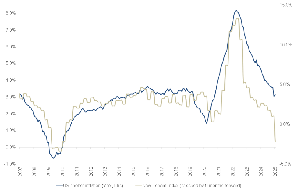 Looking at the other components (namely shelter and supercore), we expect disinflationary pressures ahead in both. Supercore inflation has historically shown a close relationship with wage growth, and as wage pressures continue to moderate, we expect supercore inflation to ease further (Figure 8). In the housing market, the weakness in market rents is pointing to further downside in shelter inflation (Figure 9). This should begin to feed through into the official data (due to lags), with shelter inflation expected to moderate more noticeably over the coming months.
