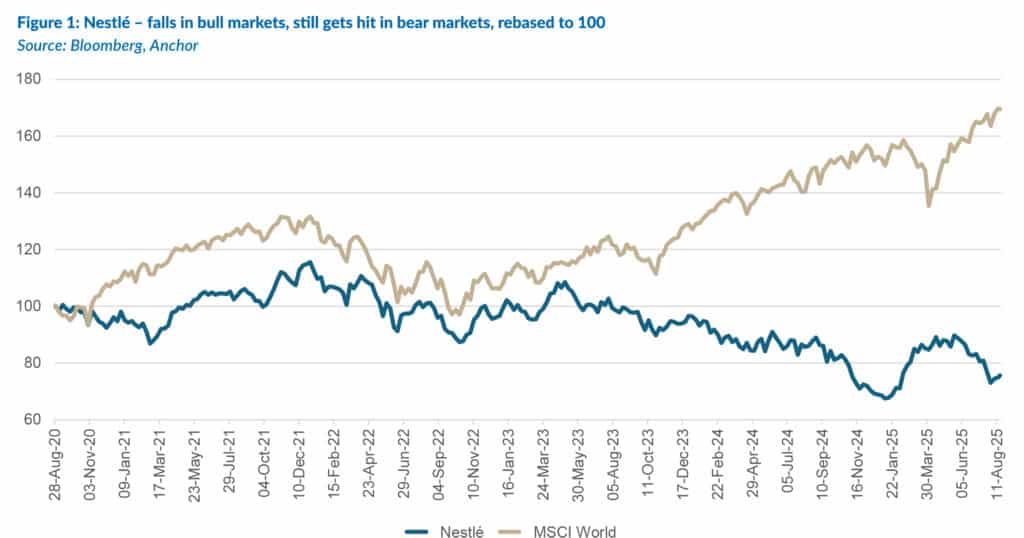 Equities are poor hedges against themselves. A defensive, stable company like Nestlé can still fall meaningfully in a bear market and then lag the market in the subsequent recovery.