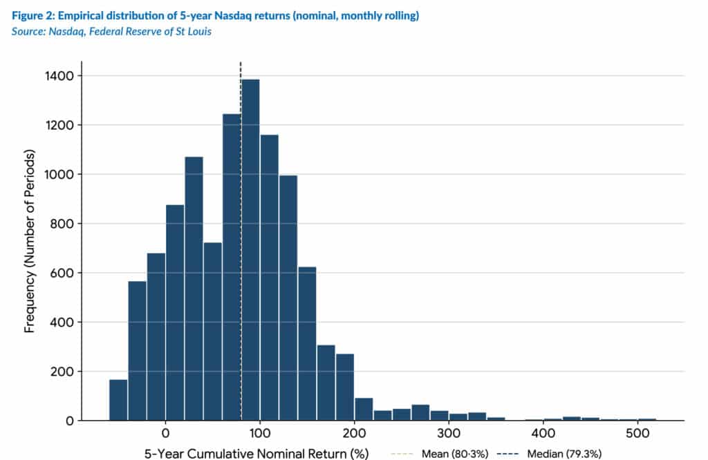 The chart below shows the distribution of rolling 5-year returns of the Nasdaq (an index that is widely believed to be high risk) based on its history. It shows that while negative outcomes over five years do occur, they are a relatively small share of possible outcomes, whereas extreme positive outcomes are possible. Over longer horizons, the skew is strongly positive.