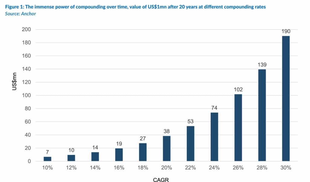 The power of compounding is immense. The difference between two companies growing at 12% and 16% in any given year may not seem significant. However, that relatively small gap compounded over 20 years can lead to significantly different valuation outcomes.