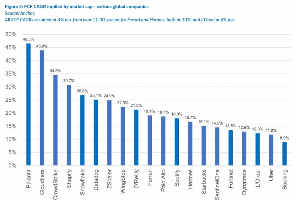 When a company has to deliver 40% to 50% p.a. FCF growth over the next 10 years (assuming a normalised starting base), that starts to feel like a valuation bubble. Companies discounting a FCF CAGR of 20%-30% p.a. look like “market darlings”. These are typically well-loved companies that are richly valued but not necessarily in a valuation bubble. This cohort includes stocks like CrowdStrike, Shopify, Datadog and Ferrari.