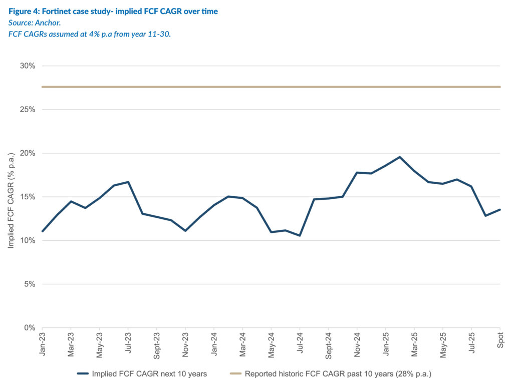 In the implied FCF CAGR chart earlier in this report, we showed that Fortinet (one of the world’s leading cybersecurity companies) is currently discounting a CAGR of 13.5% p.a. over the next decade. In the next chart, we track this implied FCF CAGR over time. At the peak of market optimism around Fortinet earlier this year, the share was discounting a FCF CAGR of c. 20%. At that point, it was nearly starting to enter the “market darling” camp. It has since fallen back on concerns about the durability of the current cybersecurity hardware restock cycle. At the recent trough, when the share sold off post its 2Q25 results, the implied FCF CAGR fell to 12.8%. The current implied FCF CAGR of 13.5% looks like a decent value, in our view.