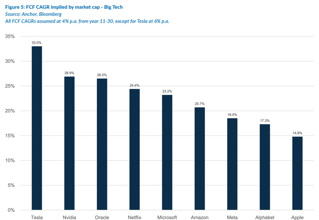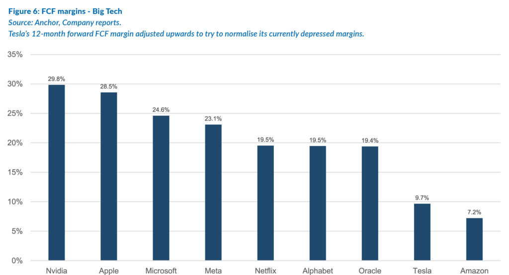 Although Tesla’s share price is discounting a relatively high FCF CAGR of c. 33% p.a., the current FCF margin is low, so the base is easy to grow from. The Tesla investment thesis is complicated and sits in a “category of one”, in our view. We follow Tesla closely at Anchor, but our views are a discussion for another day.