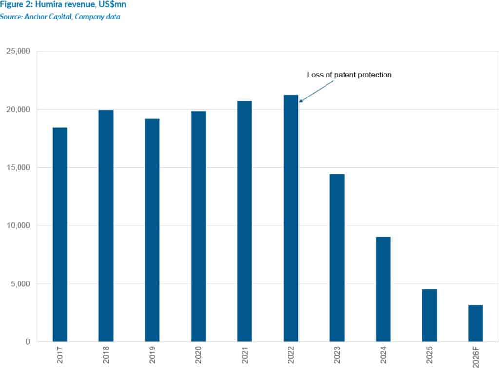 The experience of AbbVie’s blockbuster immunology drug Humira illustrates the point (see Figure 2). At its peak in 2022, Humira was the world’s best-selling drug, generating US$21bn in annual revenue. When its patent expired in January 2023, biosimilar alternatives flooded the market, and sales have fallen by c. 86% since then.