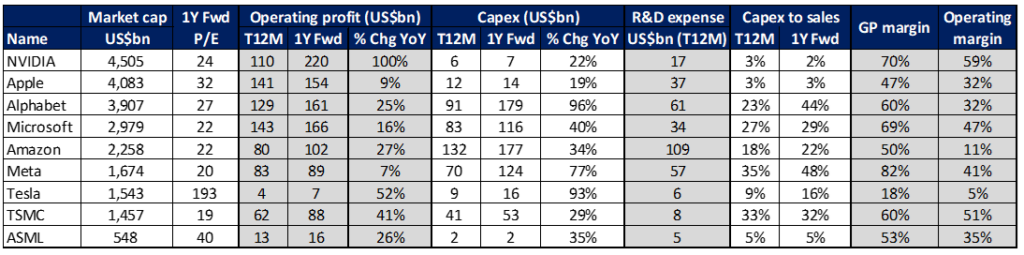 - The big spend is primarily from four companies who are building computing capacity – Amazon (US$148bn), Alphabet (US$132bn), Meta (US$123bn) and Microsoft (US$116bn).