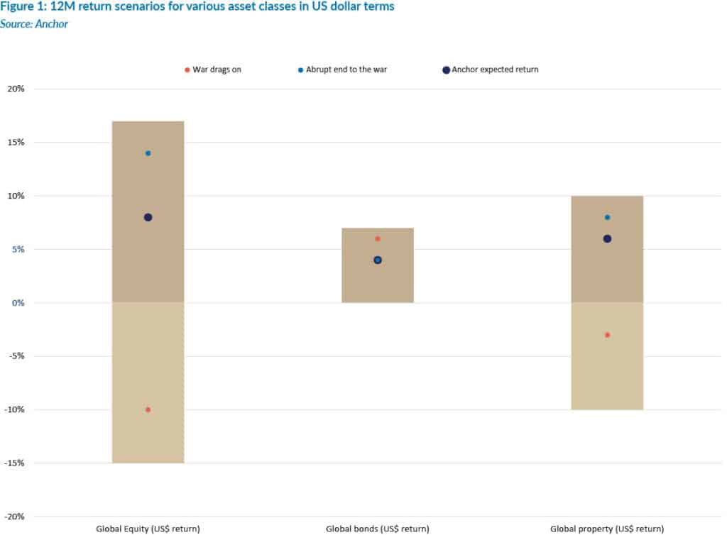 Figure 1 below highlights the US dollar return outlook for the various global asset classes. The bars in Figure 1 represent the reasonable range of possible outcomes, with the dots indicating our estimated outcomes under various scenarios. Except for alternatives (positive), we are neutral on the various asset classes, given the very high level of geopolitical uncertainty.