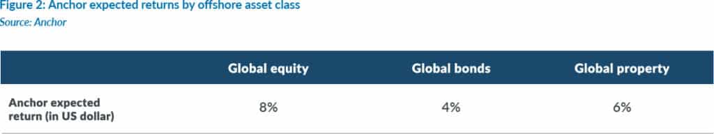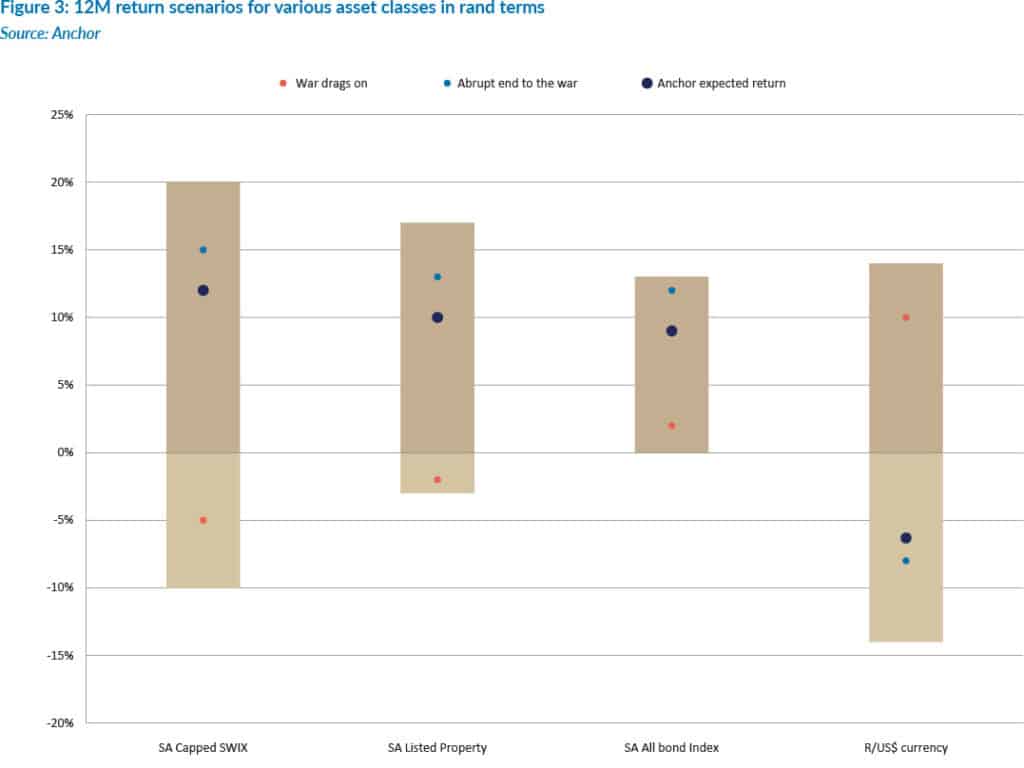 Figure 3 below outlines the rand return outlook for several domestic asset classes. The bar represents the reasonable range of possible outcomes, with the dots indicating our estimate of the outcome under various scenarios. From a domestic perspective, apart from cash (negative) and alternatives (positive), we are neutral on all asset classes, given the high level of geopolitical uncertainty.