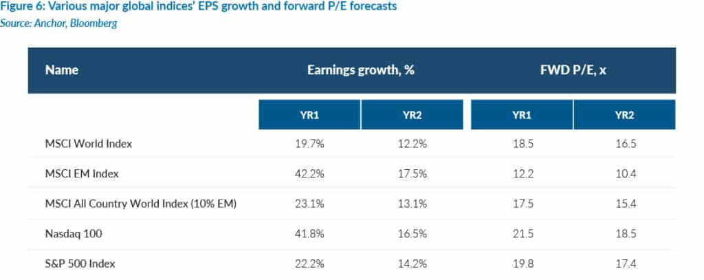 The table below shows the earnings growth and P/E multiples of the different world indices.