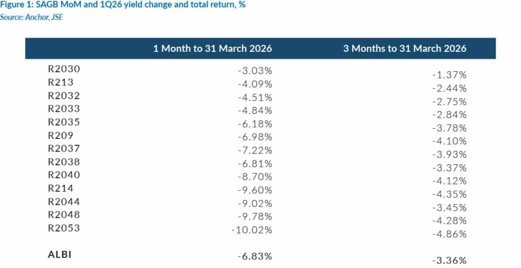 The South African Government Bond (SAGB) curve bear-flattened in 1Q26, with shorter-dated yields rising more than those at the long end. The All-Bond Index (ALBI) fell by 3.36% over the quarter (Figure 1). Gains earlier in the year, supported by improving domestic fundamentals including stronger fiscal dynamics and external balances, were fully reversed in March. The sell-off reflected a typical risk-off move, with risk premia rising across the curve and yields shifting higher by c. 120 bpts over the month due to the conflict. Following this repricing, yields now offer a more attractive entry point, and we remain cautiously constructive on the asset class.