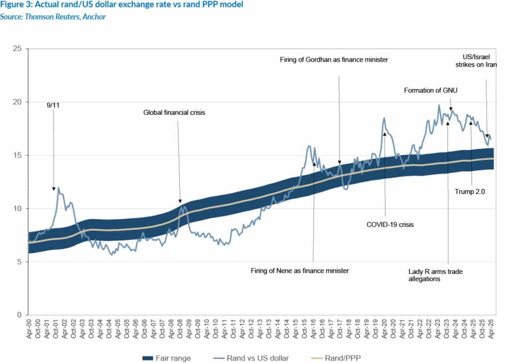That said, if we look at this rationally and consider a scenario where the war ends within the next year and that some recovery is likely, we think that a level of around R16.00/US$1 appears reasonable. This reflects a combination of continued improving domestic fundamentals, a potential relief rally once the US-led war on Iran is over and the likely higher risk premium applied to EMs for a while after the cessation of hostilities.