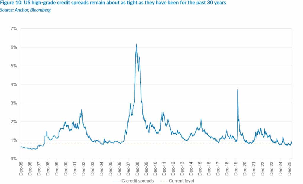 Investors in high-grade corporate bonds currently earn a yield of c. 5% p.a., with their additional compensation for taking on the risk of lending to non-government borrowers (0.8% p.a.) still about as low as it has been in the past 30 years. This leaves lenders in this high-grade market with limited protection against any default shocks. While this makes sense in the context of optimism around US economic growth, the recent wobbles in private credit markets have shown that AI disruption can also cause vulnerability in even the higher-quality borrowers. With almost no scope for further tightening in credit spreads, investors in US corporate bonds are likely left to rely on income (5% p.a.) as the sole source of their returns over the next year, while the prospect of capital losses from widening credit spreads lingers as a tail risk, albeit an unlikely one for the foreseeable future.