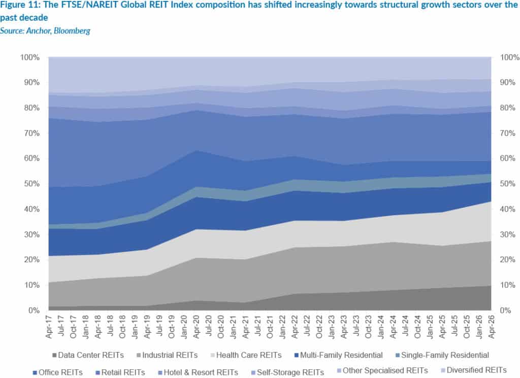The Global real estate investment trust (REIT) landscape has seen a large shift in its make-up over the past decade, as the major global REIT indices have shifted increasingly towards the structural growth sectors.