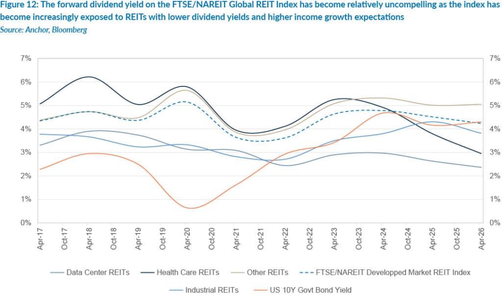 This has made the index yield appear reasonably uncompelling on a relative basis, as the index’s forward dividend yield has stayed relatively stable (c. 4.3% p.a.) while bond yields have climbed c. 2% over the past decade. Much of the reason can be explained by the shift towards faster-growing REIT sectors, where investors are willing to rely more on dividend growth than dividend yield for their total return.