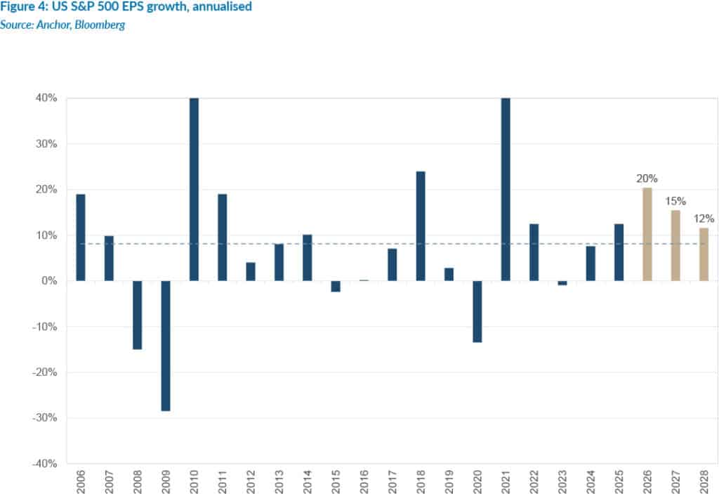 The scale of the current AI-driven investment is extraordinary (US$650bn in 2026) and continues to underpin both current economic activity and future productivity gains. While there is an ongoing debate about the ultimate returns on this capital, the near-term impact on growth and earnings is undeniable.