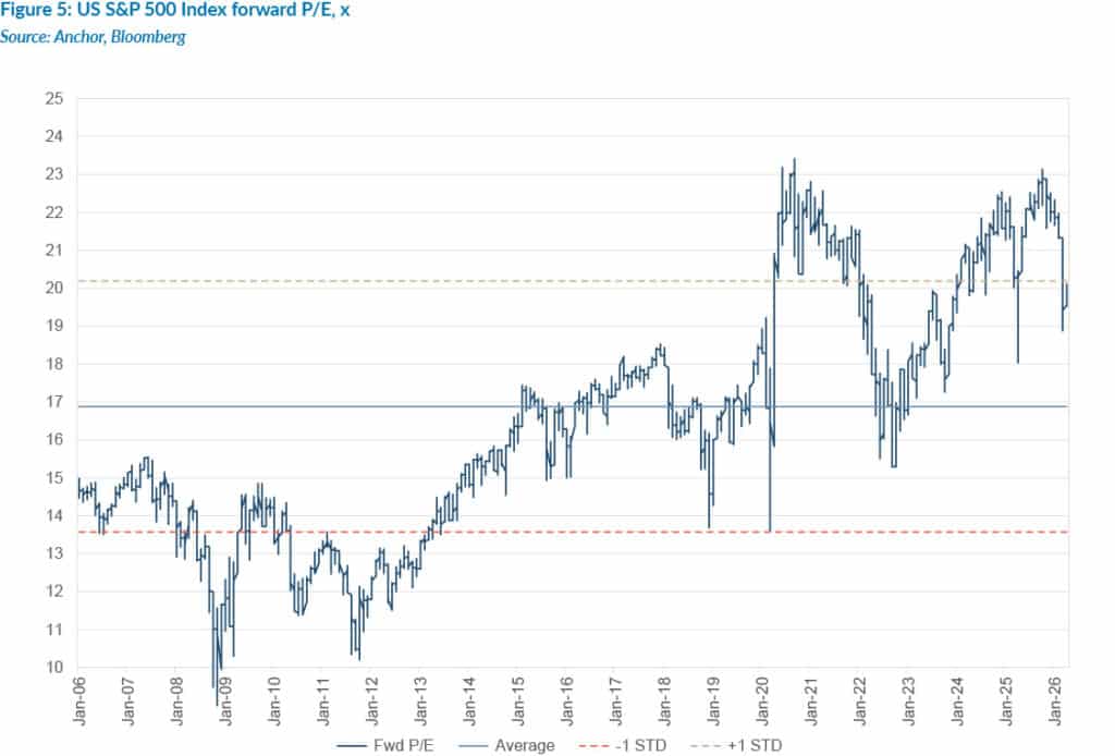 Equity markets are now approximately 10%-15% cheaper than six months ago, not because prices have fallen significantly, but because earnings expectations have continued to rise while markets have moved sideways. This is an important dynamic. It means that some of the valuation excess that concerned us at the start of the year has been absorbed through earnings growth rather than price declines.