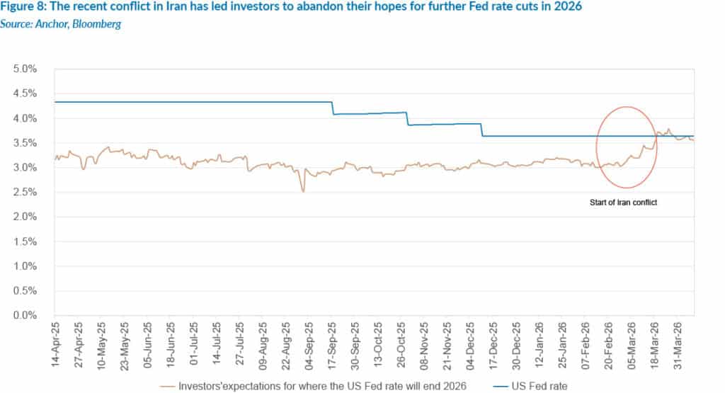 The key macro risk to this view lies in the oil price and the potential for supply disruption, particularly through the Strait of Hormuz. A sustained increase in oil prices has the potential to push inflation upwards, resulting in central banks increasing interest rates. Before the Iran war, the market expected 50 bpts of interest rate cuts in the US, and this has changed to an expectation of flat interest rates for the remainder of this year. With the US benchmark rate at 3.75%, monetary conditions remain restrictive by historical standards, but this also provides the Fed with scope to ease policy in the event of a slowdown in economic activity.
