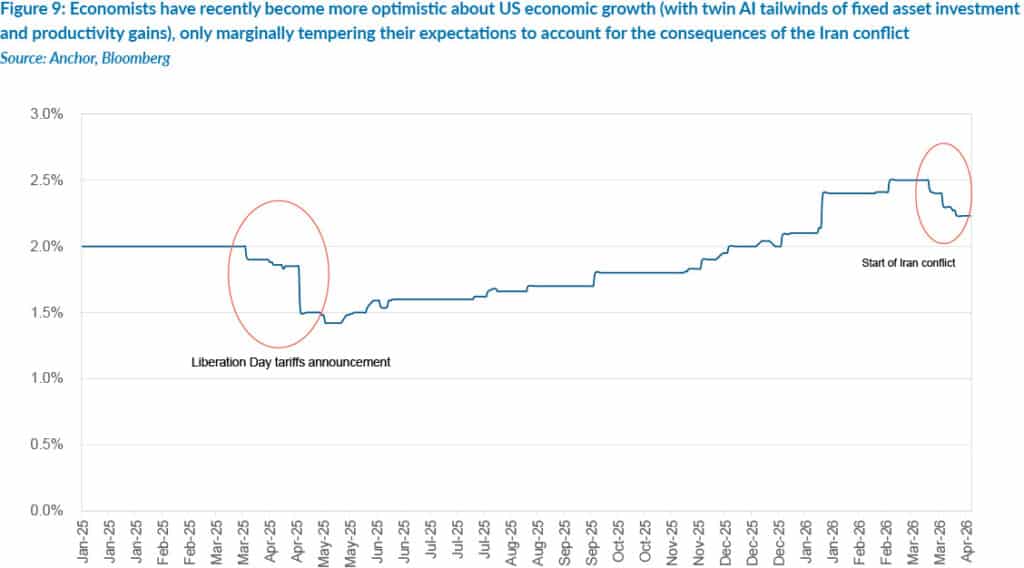 Expecting that this will end, we think Trump may find his power curtailed for the remainder of his second term. US inflation has quickened in response to higher energy prices, but the Fed is likely to look through these should the war continue to subside. AI-driven capital expenditure is expected to remain robust. This is a powerful tailwind for corporate earnings growth rates (well above historic averages), concentrated though it is across a narrow set of sectors. Policy uncertainty remains an ever-present backdrop, but the US economy will go on and is likely to hold up for the foreseeable future.