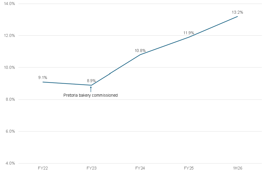 Furthermore, the new site is expected to drive improvements in bread quality and service levels, particularly in the informal channels, which is a hotly contested area of the market. Importantly, this is not Premier’s first mega-bakery. The Group commissioned its Pretoria mega-bakery in 2023, and the benefits have been evident since (see Figure 4).