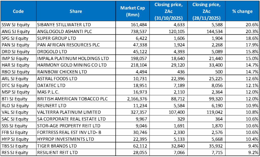 Logistics and mobility company Super Group (October’s top-performing share) gained another 18.6% in November. Its strong rebound has been driven, in part, by improved investor sentiment on the back of signs that the company is turning a corner after it upgraded its revenue guidance. In April, Super Group unlocked R7.47bn in capital by disposing of its 53.6% interest in SG Fleet Group. It used part of the proceeds to reduce its debt and paid a special dividend of R16.30/share in June. The restructuring has strengthened its balance sheet and sharpened the Group’s focus on its logistics and mobility operations in Africa, Europe, and the UK.