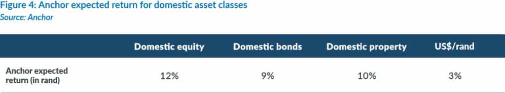 Figure 3 below outlines the rand return outlook for several domestic asset classes. The bar represents the reasonable range of possible outcomes, with the dots indicating our estimate of the outcome under various scenarios. From a domestic perspective, we anticipate a modest recovery in the rand as it approaches its fair value. We are most positive on equities, which show a promising prospect of continued gains and potential upside surprises.