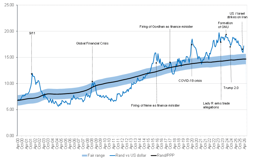 Locally, market dynamics and the weaker rand have been driven largely by sentiment. We remain of the view that fundamentals do not really support a rand weaker than R17.00/US$1 at this stage. However, in periods of elevated uncertainty, market pricing can deviate materially from fair value. We are seeing massive swings based on whether Trump’s random tweets on Truth Social are deemed to be inflammatory or de-escalatory in nature. This means that the rand can still weaken meaningfully away from its fair value or strengthen. As seen in previous global shocks, including the COVID-19 pandemic, overshooting remains a risk, and it is quite plausible that the rand breaches R19.00/US$1 again. Still, this is neither our base case scenario nor likely. It is all about how far the escalation of the conflict goes and when it simmers down.