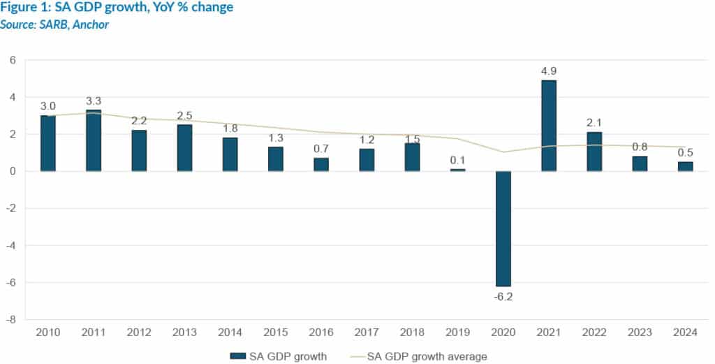 The alarmingly high youth unemployment problem in SA is multifaceted, being both structural and cyclical in nature and driven by the country’s poor economic performance. The domestic economy has not grown fast enough to reduce unemployment meaningfully. A helpful way to assess a country’s economic performance and size is by examining its real gross domestic product (GDP). Strong real GDP growth typically indicates a healthy economy with rising employment levels. The economic rule of thumb is that real GDP needs to grow by 3%-plus YoY to enable sustained job creation. Over the past 14 years, SA’s real GDP growth has averaged just 1.31% p.a.