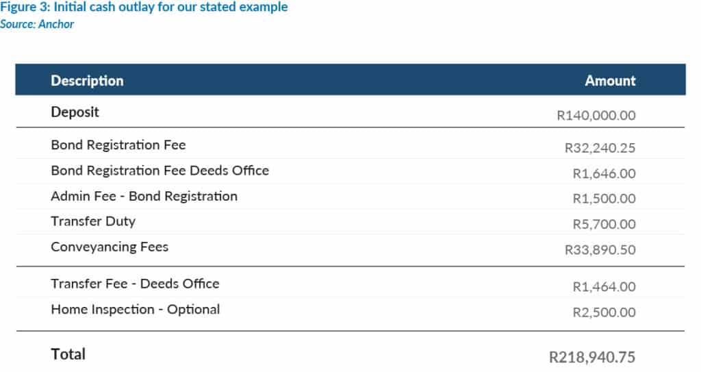 - Bank admin fees: The final costs of the bond may be administrative costs levied by the financial institution processing the buyer’s bond registration. This varies, but an assumed amount of R1,500 will be utilised.