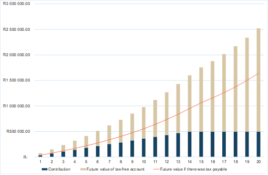 An individual contributes the annual maximum of R36,000. We cease contributions when we reach the overall lifetime limit of R500,000. We assume a 10% p.a. growth rate and an inflation rate of 6% p.a. To illustrate a comparison, we take an overall 25% tax rate on returns.